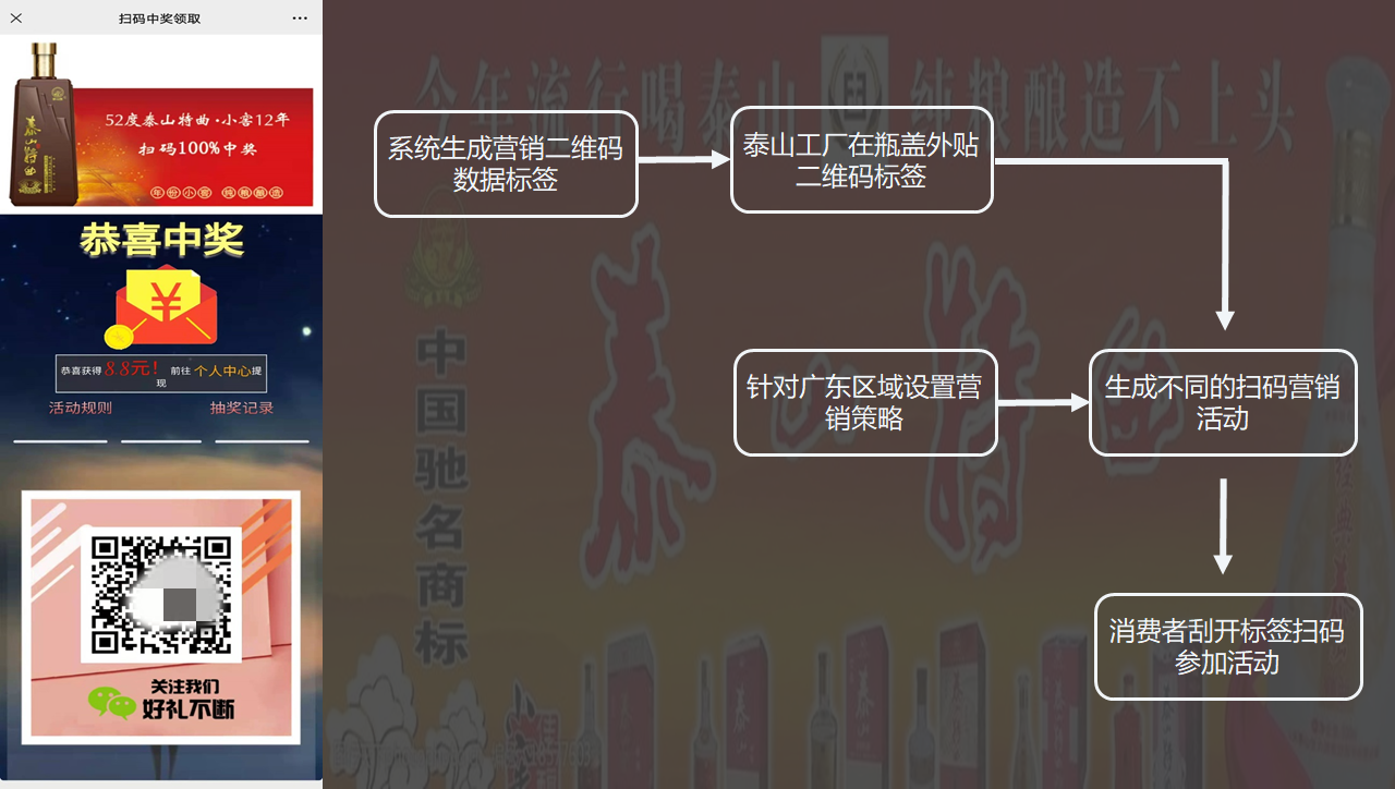 其中泰山特曲酒廣東總經(jīng)銷商為了提升廣東區(qū)域的產(chǎn)品銷量,委托彌特盈泰幫助建設(shè)一物一碼營(yíng)銷系統(tǒng),并創(chuàng)建多個(gè)掃碼紅包營(yíng)銷活動(dòng),通過針對(duì)消費(fèi)者的掃碼領(lǐng)紅包獎(jiǎng)勵(lì),提升廣東區(qū)域的銷量和復(fù)購(gòu)率。